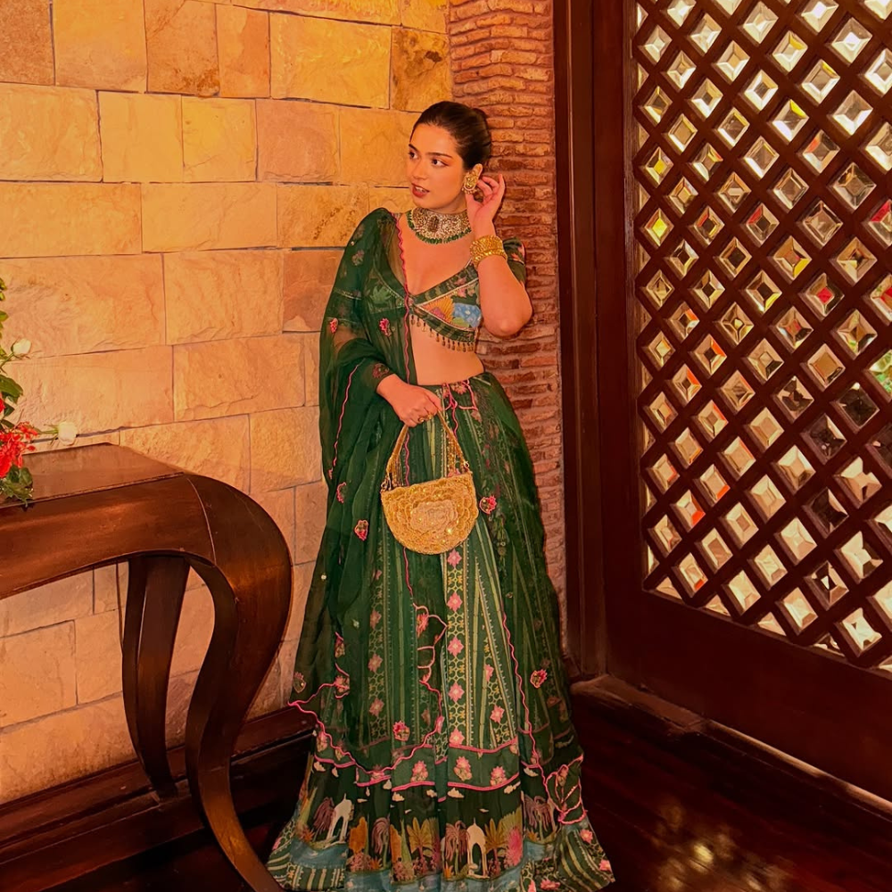 Harshita chose to pair our Golden Blossom Flap Purse to elevate her regal mehendi look with a golden touch of tradition and glam. The intricate zari work and shimmering gold detailing perfectly complemented her emerald lehenga and statement jewellery, tying her whole outfit together like a dream. This handcrafted piece adds just the right pop of luxury to ethnic ensembles, making it the ideal accessory for festive functions, sangeets, or wedding events.