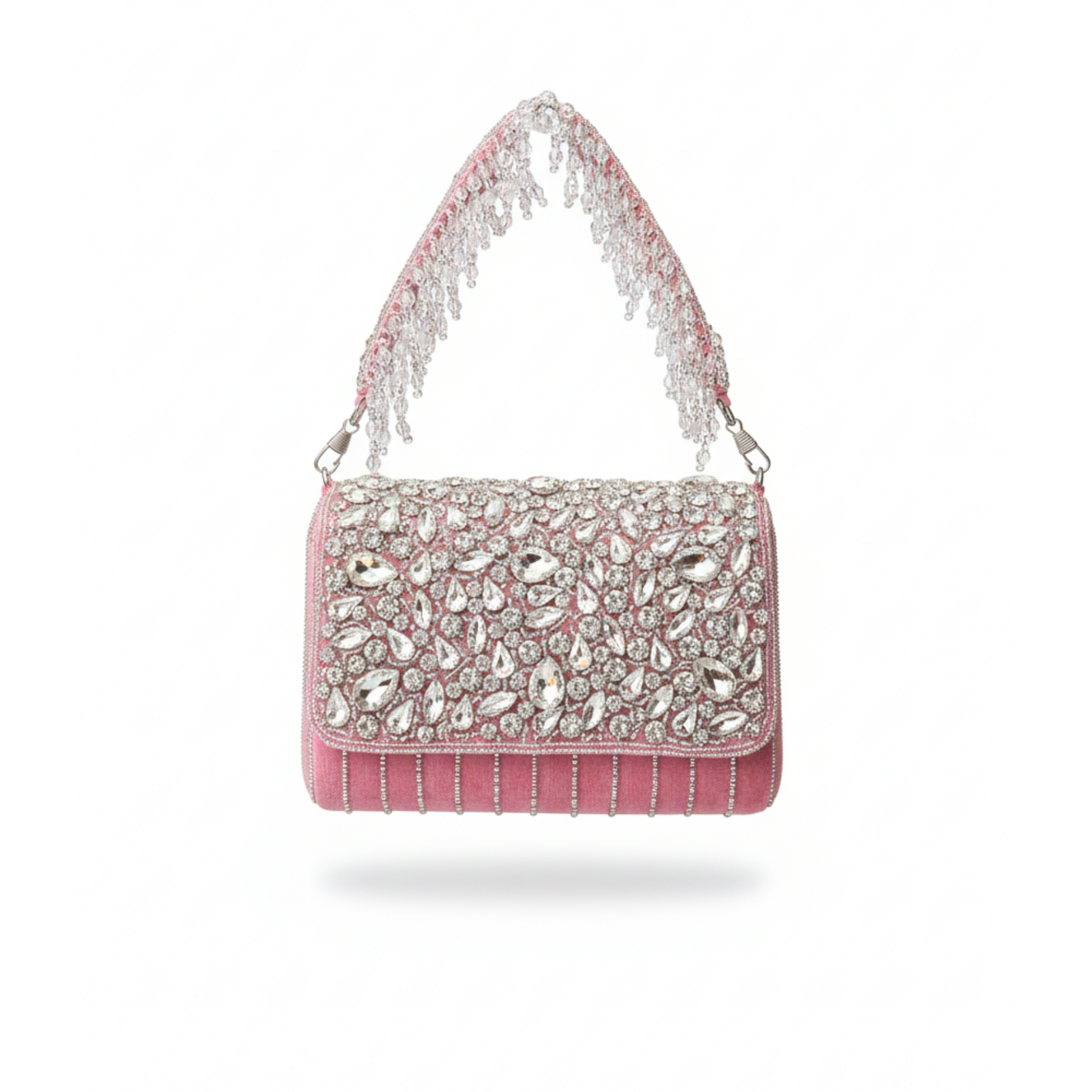 The Ariana Crystal Purse is an absolute showstopper—crafted in a soft pink base and drenched in dazzling oversized crystals that catch the light from every angle. Its statement crystal-encrusted handle adds dramatic elegance, while delicate fringe details create luxurious movement. Perfect for sangeets, receptions, cocktail nights, and glamorous evenings, this purse is designed to shine as brightly as you do.